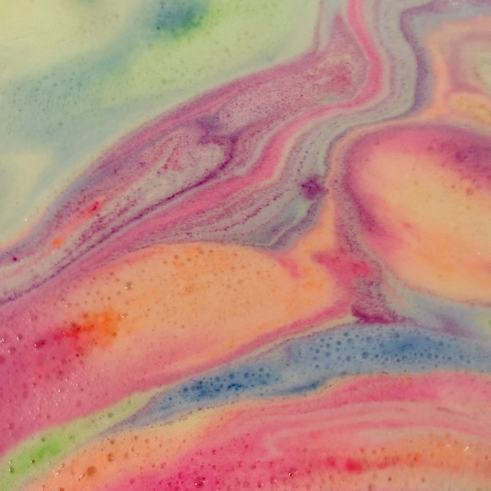 Rainbow (neon blue, purple, pink, orange, green, yellow) coloured bath bomb rocks and bath dust, made with Shea oil. Vanilla scented.